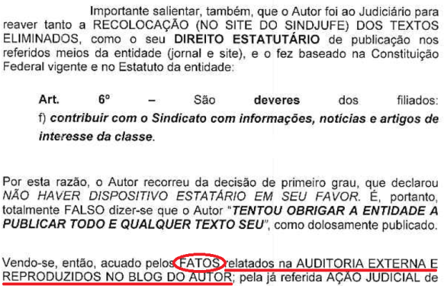 Este então filiado NÃO foi ao Judiciário para “tentar obrigar a entidade a publicar todo e qualquer texto seu”. O objeto daquela primeira ação contra o Sindjufe (NÃO essa) foram: 1) a volta àquele site oficial dos textos então repentina e bolsonaramente eliminados e 2) a volta do seu direito expresso no art. 6º do estatuto daquela entidade, como consta dos autos (fl. 16):