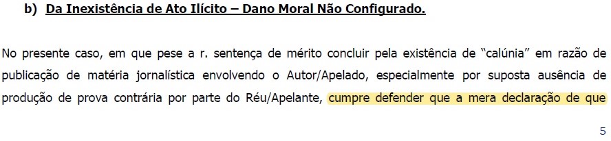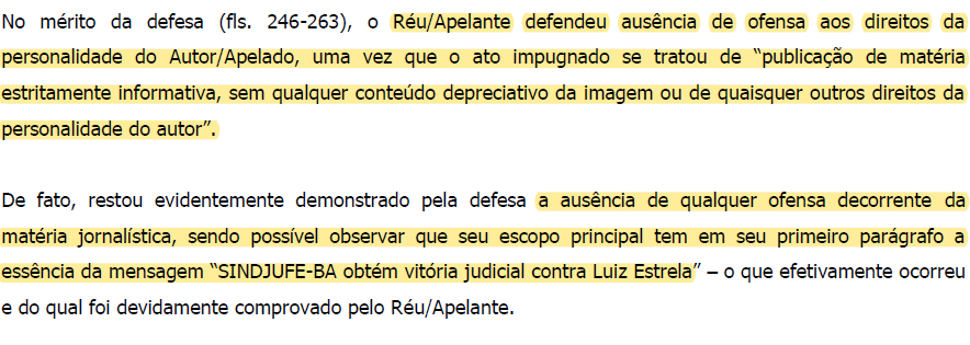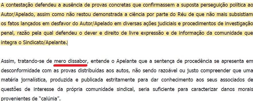 - na fl. 429, volta-se à mesma falsificação, alegando que “… Neste ponto – e não se pode negar – diversas decisões foram consignadas aos autos objetivando demonstrar que, efetivamente, o Autor respondia por ações em que se questionava atos supostamente praticados pelo Autor/Apelado…”, o que, estranhamente, se fez sem informar a folha dos autos correspondente a tais “diversas decisões consignadas”. Indiscutível, portanto, Excia, é que, ao publicar a tal falsa notícia, o sindicato extrapolou os limites da informação, prestando informação falsa e evidenciando a intenção de injuriar, difamar e caluniar , restando clara, portanto, a responsabilidade civil por danos morais, nos termos da própria jurisprudência de fl. 429 e dos artigos constitucionais e infraconstitucionais acima citados, todos já abordados nas fls. 22/31 (…);