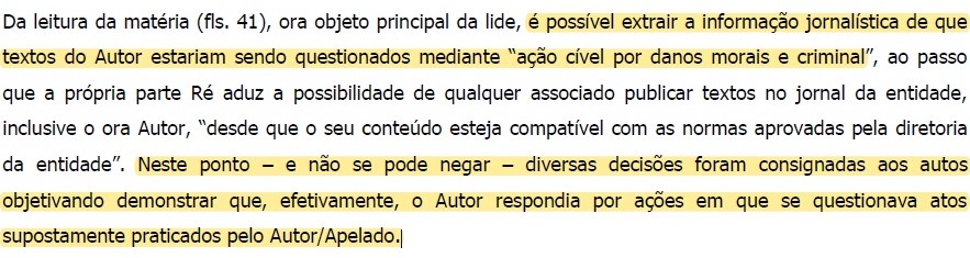 - estando o Apelante/réu (…) de posse dos documentos de fls. 53/56, 381/384 e 389 (…) e já tendo essa mesma entidade admitido, na matéria publicada em 25/02/11 (e reproduzida nas fls.352/353), a MÁ-FÉ da acusação ao Autor (diretamente na PF e no MPF), é evidente que ela já estava CIENTE da falsidade dessa notícia de 25/10/11, ao contrário do alegado nas fls. 427/429. Note-se que, naquela matéria de 25/02/11, aquela entidade/ré declara que o Autor/apelado compareceu a uma assembleia geral e “…pediu a palavra e falou acerca de um processo …”, declarando, ainda, que aquela falsa denunciação feita à Polícia Federal e ao MPF (de teor igual à feita aos Juízos Criminal e Civil) foi baseada em “sugestão” e “suspeita”, conforme já ressaltado naquelas mencionadas fls.352/353 e 379;