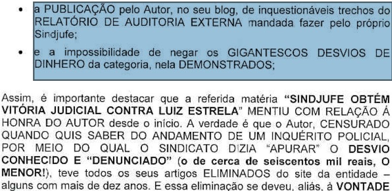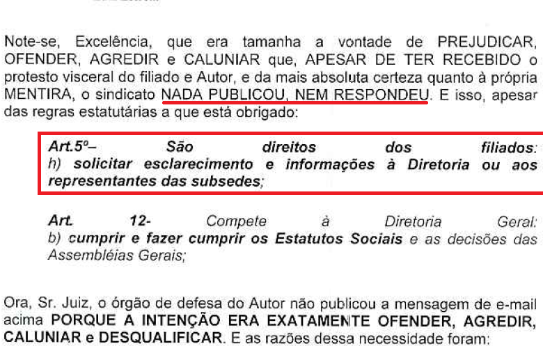 Mas, em 25/10/11, o mesmo sindicato fez a falsa publicação, pela qual está condenado. Tanto era falsa (e ele o sabia) que (contrariando os artigos 5º do seu próprio estatuto e 5º, V da CF) NÃO publicou o imediato e-mail com pedido de resposta/contraditório (em que toda aquela leviandade estava demonstrada). Veja-se esse mimoso trechinho da inicial (fl.15):