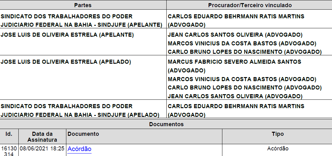 Inicialmente, cumpre apreciar a impugnação ao deferimento da gratuidade da justiça realizado pela apelada. Deve-se destacar que o SINDJURFE SINDICATO DOS TRABALHADORES DO PODER JUDICIARIO FEDERAL DA BAHIA não acostou documentos com vistas a revogar a gratuidade da justiça concedida (…) Realizadas tais considerações, passa-se à análise do mérito recursal.