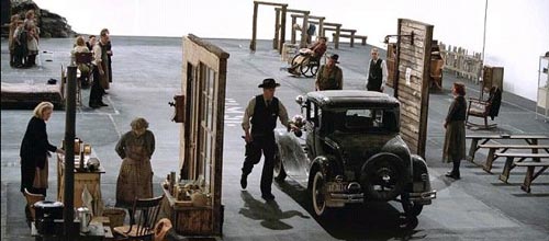 Filme? Teatro? É interessante ouvir o toc, toc e o ranger de portas que se abrem e fecham sem existir. Tudo quer deixar claro que se trata mesmo de ficção e que o mais importante ali não é o cenário, mas o que ele encobriria**. Tanto que, embora tênues, as luzes claras de Dogville se jogam sobre o trivial, quase suicidamente. Ajuda-as a própria cidade, que não existe fisicamente. Só no papel, como imóvel na planta. Não fosse assim, talvez as câmeras não deslizassem tanto sobre trilhos tão recônditos do set humano. Set humano, entenda-se, é a vida como ela é: Desejo. Poder. Representação. E nela, cada criatura se debate entre o que é e o que pretende, inclusive dizer. Às vezes (não sempre) aparece uma que se compromete a desempenhar o seu papel de forma a não envergonhar-se dele. É o caso de Grace, a figura central do filme. Mas, coitada, que escolha infeliz!