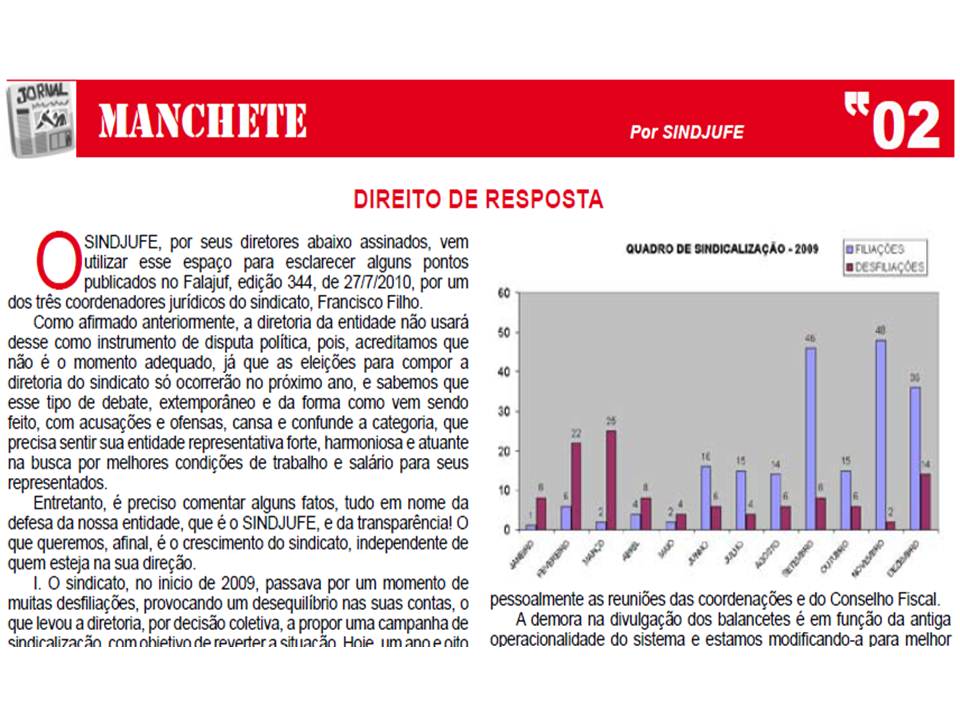 Com o estouro da boiada (publicação de DESVIO NO SINDJUFE É DE MAIS DE MEIO MILHÃO!) e a sua repercussão, entretanto, a diretoria da entidade solicitou espaço no FALAJUF (divulgação interna dos servidores da JF) e publicou o que chamou de “DIREITO DE RESPOSTA”, onde se escondeu da categoria. Por que não publicou esse “DIREITO DE RESPOSTA” (sob outro título, claro) nos nossos site e informativo impresso oficiais? Por que não merecemos esse esclarecimento? O fato é que, falando baixinho e para poucos (no FALAJUF), brincou de ser vítima (como sempre. Veja matéria ME ENGANARAM, abaixo ) e chegou a dizer que as denúncias do Diretor Francisco (e, certamente o conteúdo da AUDITORIA que este blog publicou) eram “… acusações e ofensas que cansavam e confundiam a categoria…” Falou-se, também, que “…o andamento da investigação policial se encontrava presa às burocracias e ineficiências do estado baiano…” Veja: http://www.asserjuf.org.br/falajuf2010/345/345.pdf .