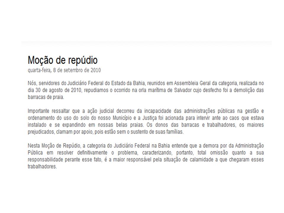 Lembremos que, segundo o site Sindjufe, a “categoria“chegou até a aprovar uma moção de repúdio (clique na imagem ao lado) contra a demolição das barracas de praia de Salvador, obra de uma demorada conjunção Ministério Público/Justiça Federal (http://www.sindjufeba.org.br/Noticias.aspx?id=643). Ô, psiu! Vamos ser francos? A praia estava toda loteada pelas cervejarias, e as barracas ainda ocupavam uma área que a Marinha não permite. Ou seja: interesse público, salvo engano. Mesmo assim, a “assembléia“, talvez na falta do que pensar, resolveu chamar a si a questão. Se ainda fosse o Partido, em outro ambiente, vá lá. Mas, entre nós? Quando é que esse sindicato vai nos pertencer, meu deus? Por que nunca votamos uma moção de repúdio ao DESVIO COMPROVADO ou ao fato de o sindicato SÓ DISPOR DE BLANCETES CONHECIDOS DE 2008 para cá, como demonstrou o Diretor Francisco? Veja: QUEM ESTÁ CURTINDO ESSA FESTA? Aliás, por que será que os articulistas consentidos pela diretoria não abordam esses temas? Por que tanta carência de olhar para o céu, tendo a terra aos pés, meu deus? Alienação? Que deuses nos afastam de nós mesmos? Os do “socialismo“?
