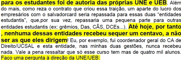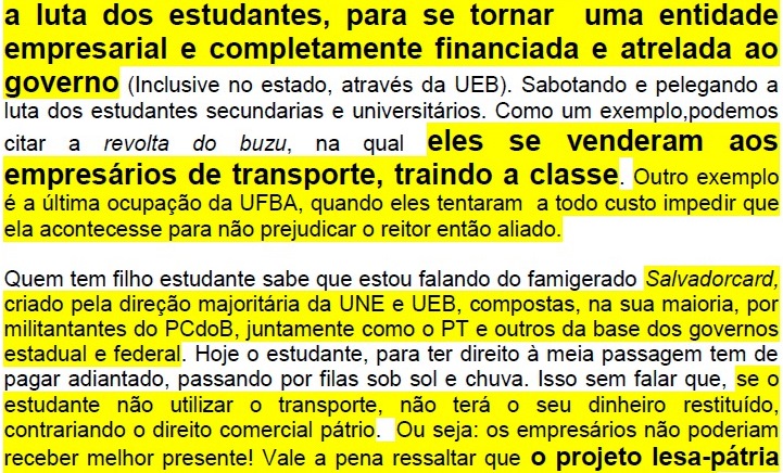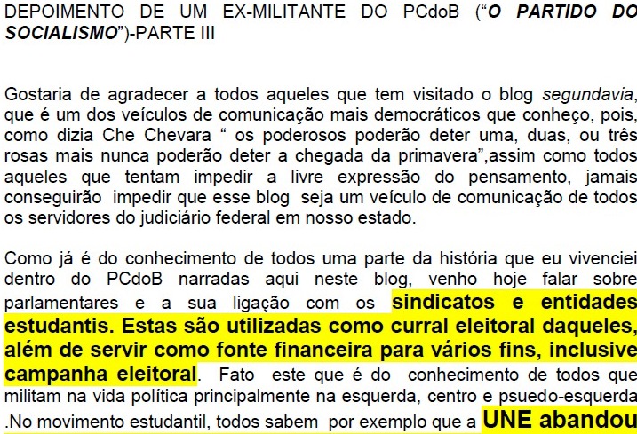 “…terminado o congresso, nós conseguimos todos os cargos de direção da UJS (união da juventude socialista), mas a direção do partido (PCdoB), que não tem nada de democrática, nunca reconheceu isso e boicotou todas as nossas atividades. Desencadeou-se, inclusive, uma política de terra arrasada. Nós não tínhamos apoio nem recurso para fazermos nada. Aos poucos, só restaram duas opções: vender-se à direção do partido (cooptação através de cargos, assessoria parlamentar, sindicatos…) ou sair do PCdoB. Eu fui o último a sair…”