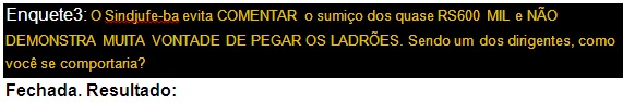 Voltando: a sua participação nas enquetes é muito pequena, leitor. E só lhe custa um clik! Você deveria participar mais. A propósito, por que será que o Sindjufe-ba não divulga o total real de votantes nas suas pesquisas? Mister M sabe.