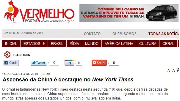 Só que o portal fez uma matéria altamente elogiosa sobre a China (http://www.vermelho.org.br/noticia.php?id_secao=2&id_noticia=135200), quase dizendo que a atual segunda economia do mundo é socialista. Coitado! Capitalista e das brabas! Veja uns pedacinhos de outras páginas amarelas, por onde também passou o Brasil. Entrevistado: o norte-americano Robert Fogel, Nobel de economia (1993).