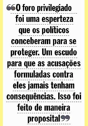MINISTRO: O foro privilegiado, como o nome já diz. reflete bem essa distinção cruel que não deveria existir. Uma vez es chamei atenção para isso aqui no plenário do tribunal. Você se lembra quando o presidente Bill Clinton foi inquirido pelo Grand Jury? O que é um Grand Jury nos Estados Unidos? Nada mais que um órgão de primeira instância, composto de pessoas do povo. Era o presidente dos Estados Unidos comparecendo perante esse júri. falando sob juramento, sem privilégio algum. O homem mais poderoso do planeta submetendo-se às mesmas leis que punem o cidadão comum. O foro privilegiado é a racionalização da impunidade.