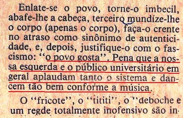 Tudo bem, os investidores e talvez até a grande massa poderiam dizer: é NEGÓCIO (é só pra ganhar dinheiro!… nada diferente da política, aliás, outrora também palco de grandes temas… É verdade. Mas, meu amigo, o fim das utopias que incomodou Cazuza lá pelos fins dos 80 (…ideologiaaa, eu quero uma pra viver… Veja ILUSÕES PERDIDAS) parece mesmo ter encontrado na Bahia o lugar para a sua glória. E como – segundo a lenda – baiano burro nasce morto, nós caprichamos. Fim de ideologia ou utopia? Que nada! Isso é bestagem! Nós tínhamos coisa mais importante. A nossa cultura tinha: o Fim da Letra e da Emoção. E não é de agora que digo isso, não (Tribuna da Bahia, 21dez87; veja eus):