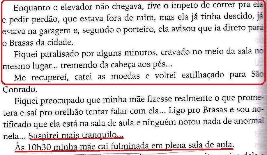 No enterro, o não mais Churupito diria, por escrito: “…minha mãe … que loucura essa vida… nem sempre se vê lágrima no absurdo…” (fl.258)…