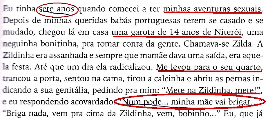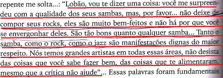 “…Ele logo me avistou, foi ao meu encontro já com a mão esticada (…) e se autoanunciou: ‘muito prazer, Nelson Gonçalves, eu sou você anteontem’. ‘Que prazer em conhecer o senhor, meu mon…’. ‘O Senhor é o caralho! Porra’ (…) Tenho certeza que sou bem mais maluco que você, porra’ (…) e fazia questão de escarrar no tapete a todo instante: ‘Ô Lobão, sabe porque eu escarro no tapete desta merda?”… (fl.339)