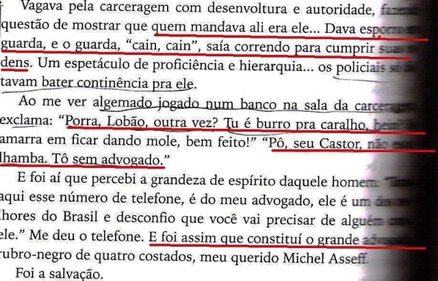 Saído da cadeia, Lobão enfurna-se “…em leituras beat como Kerouac, Burrougs, Gisberg, Bukowsk …” (muito usada na época. Como estudante, eu mesmo fiz uma monografia a respeito) … e decide “…explorar o submundo” (fls.277). Recebe convites de “traficantes carentes” que “…clamavam por sua presença em suas comunidades…” (fl.387) e sobe o morro. Até em arma pega.