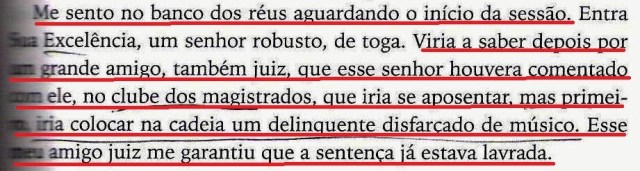 e barriga (proibido o uso de vassouras ou rodo, fl. 318) e recebeu a visita do pai, que buscou ajuda ao Dr. Roberto Marinho (fl.319). Foi solto. E fez o Canecão, lotado, cantar o hino nacional ao som da sua guitarra: “…houve um momento em que o tempo se congelou naquela imagem…” (fl.341). Deste período, a fl. 344 traz um diálogo entre esse filho da classe média branca, educada e cabeludo e um preso que lhe ofereceu um cobertor, na sua chegada: