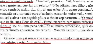 Antes dos 20 anos, Lobão, cuja mãe tinha hsitórico de angústia, já tinha tido uma terrível briga física com o pai – um dos momentos mais difíceis do livro – e, já casado, engoliu uns quarenta comprimidos da medicação com que controlava a epilepsia (fl.187), o que se repetiria. A morte de D. Ruth, fulminada por uma tempestade de que o filho se sentiu raio, não deixa de lhe ser outra implosão (256):