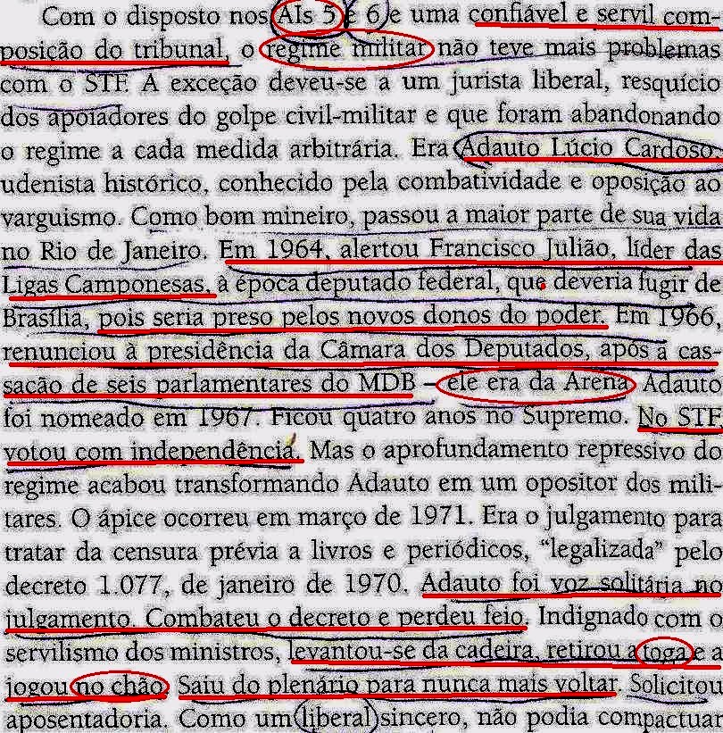 “exceções”, continua, “…acabaram sendo punidas com a aposentadoria dos ministros ‘rebeldes’ e com a complacência dos pares…”. Sabe como é, né, leitor? NADA É TUDO. Mas olhe que caráter: quando deputado, o então futuro ministro Adauto Cardoso era da Arena (o PFL dos militares!), que era o partido do diabo da época. Mas e daí? A esquerda, em especial o PT, não era o partido de deus (verdade seja dita: o mesmo nunca se pôde dizer do PCdoB)? E não aconteceu o que aconteceu? Voltemos ao caráter: