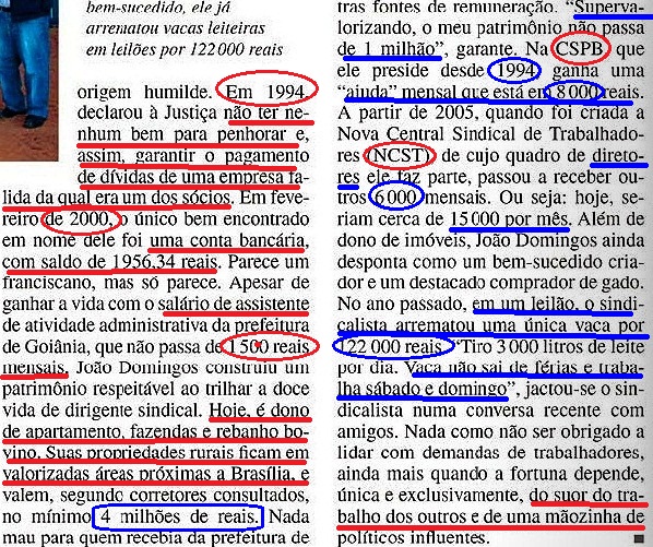 Até 1994 ele não tinha bens dignos de penhora. Em fevereiro de 2000, o único bem encontrado em seu nome foram menos de dois mil reais em conta bancária. Ele é funcionário de uma pequena prefeitura goiana, e o seu salário não passa de R$1500,00 (mil e quinhentos), segundo a “reacionária” revista Veja (ed. 2257, 22fev12). Mas, tornado dirigente sindical, reuniu alguns bens que, segundo ele, não passam de um milhão de reais. O seu nome é João Domingos Gomes dos Santos, presidente da CSPB (Confederação dos Servidores Públicos do Brasil –http://www.cspb.org.br/diretoria.php), e ele foi um dos entrevistados de Alexandre Garcia, ontem, na Globo News (êta coisa ruim, essa “imprensa burguesa“, meu deus!). Veja que linda história: