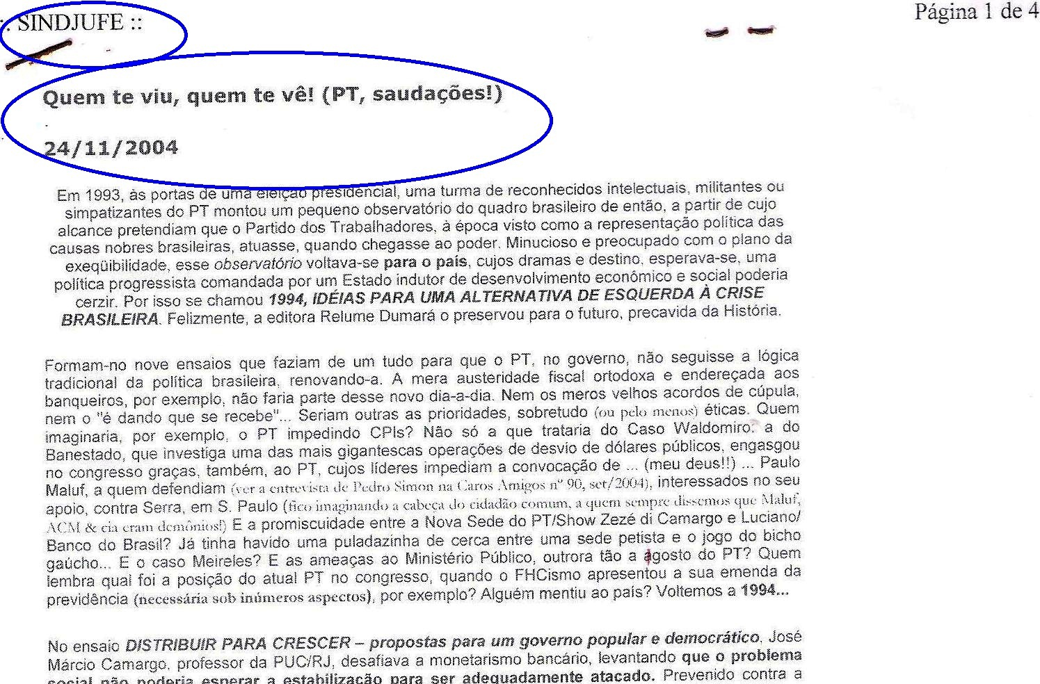 Atenção, leitor: este texto é posterior ao escândalo Waldomiro Dinis e anterior ao Mensalão e já foi ligeiramente publicado no site Sindjufe (2003). Digo “ligeiramente” porque, até então, um “artigo de servidor” apenas rolava literalmente na tela, entre outras notícias. E, com elas, desaparecia (ainda não havia a seção ARTIGOS…). O título original era Quem te viu, quem te vê! (PT, saudações!):