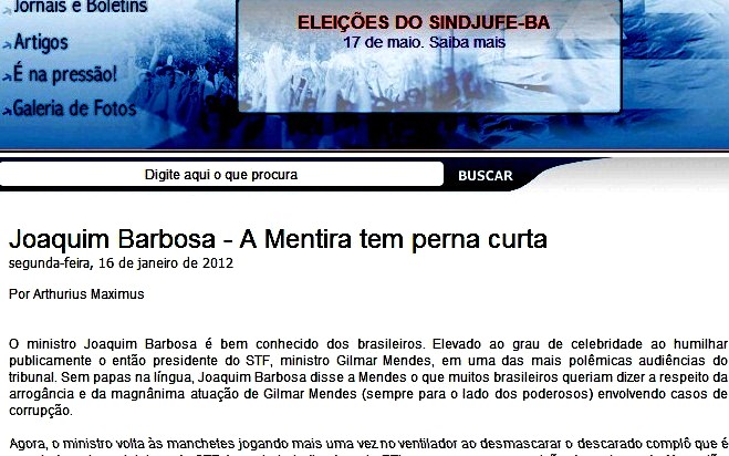 o povo? Não! Isso ficaria para as Jaquelines da vida (veja mais em O FESTIVAL DA CARNE: CARNAVAL, A JUSTIÇA DEPOIS DO MENSALÃO- MINISTRA ELIANA CALMON, POLÍTICA COM VATAPÁ, SEM MEDO DE SER FELIZ, DAS FLORES E DOS FRUTOS…). Mas, como quem não tem cão caça com gato (como dizia a minha mãe), que o Povo a quem o PT um dia salvaria inclusive da corrupção o salve, né? E não é para isso, aliás (e para ajudá-lo a refletir melhor) que a imprensa não-burguesa força a mão nos seus artigos? Não faz muito, lembremos, o site da “esquerda bem informada” chamou o Ministro Joaquim Barbosa de “Herói da Mídia”, não foi (veja LULA LÁ, GULLAR, ALDO REBELO… (e Marcos Valério)? Chegou mesmo a afirmar que a grande imprensa denunciava e o Ministro confirmava … Que maldade! Já na época do hoje companheiro Collor e de FHC… (basta ver DESCANSANDO). E olha que até o Sindjufe-ba pré-VITÓRIA HISTÓRICA (da mesma matéria de que é feita aquela “esquerda’) ressaltou o papel
