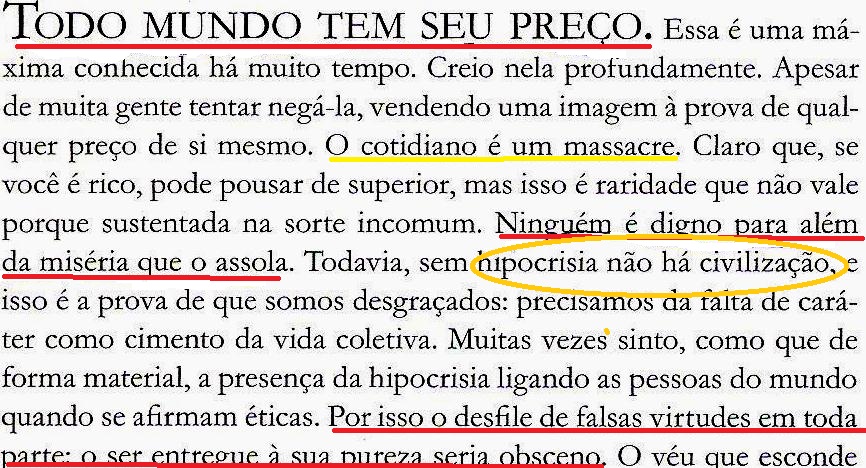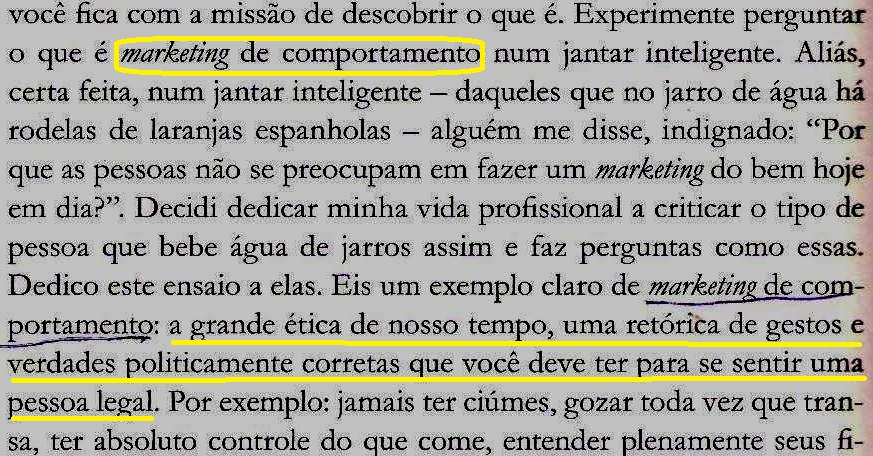 “…claro que Coca-Cola jamais, muito menos MacDonald’s. Esse pacote faz parte da estética de comportamento. Claro que você deve ser sustentável em tudo, reciclar lixo, se indignar com toda forma de injustiça social (…), mas desprezar toda forma de intolerância no cotidiano, por exemplo, com pessoas mais pobres, menos cultas, menos profissionalmente capazes e, principalmente, menos bonitas… (fl.98)
