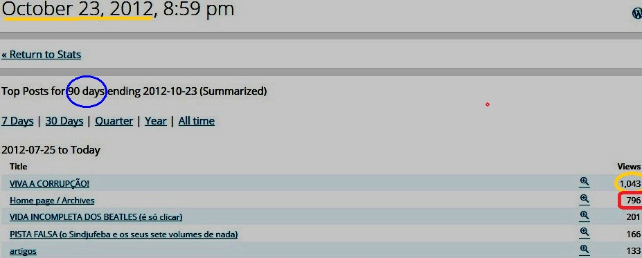 Notou que o mês de maior visitação foi maio/12 (mês da eleição/Sindjufe)? Só que voltamos àquela marca em setembro e outubro (e hoje ainda são 23), sem que o post-sensação daquele momento (POR QUE … DESISTIU?) nem esteja entre os dez mais em todo o tempo do blog (a página principal não conta porque tudo já passou por ela):