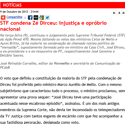 “…Demóstenes Torres foi expulso do DEM antes de qualquer condenação, quando patenteou-se que ele operava como despachante de luxo da quadrilha de Carlinhos Cachoeira. José Dirceu foi aclamado como herói e mártir pela direção do PT depois da decisão da corte suprema de uma democracia de condená-lo por corrupção ativa e formação de quadrilha (…) http://oglobo.globo.com/pais/noblat/post.asp?cod_post=471990&ch=n. Veja mais em CONTRA UM MUNDO MELHOR.