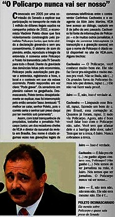 Ao pedir o indiciamento do jornalista de VEJA Policarpo Júnior, o relator Odair Cunha, do PT de Minas Gerais (…) recorreu a expedientes condenáveis. O mais grave deles foi suprimir do relatório a mais límpida evidência da conduta absolutamente correta do jornalista de VEJA. Odair Cunha desprezou o exaustivo trabalho dos integrantes do Ministério Público e da Polícia Federal encarregados das investigações e das escutas legais feitas no contexto das operações em que o jornalista de VEJA é citado.