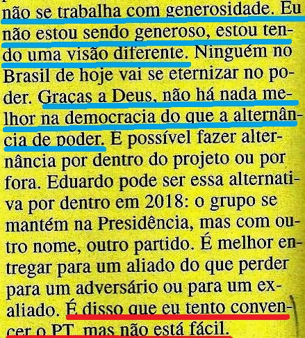 – ‘Eles têm partido. O risco é outro. É que esse partido …” (leitor? Se ligue!) “…. perca a convicção ao ganhar e fique sem rumo. Se ficar muito tempo, vira PRI, torna-se uma máquina com o único objetivo de manter o poder…”