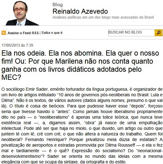 O sociólogo Emir Sader, emérito torturador da língua portuguesa, é organizador de um livro de artigos intitulado “10 anos de governos pós-neoliberais no Brasil: Lula e Dilma” (…) O título é coisa de beócios. Para que pudesse haver esse “depois”, forçoso seria que tivesse havido o “antes”. Como jamais houve liberalismo propriamente dito no país — o “neoliberalismo” é apenas uma tolice teórica, que nunca teve existência real —, a, digamos assim, “obra” já nasce de uma empulhação intelectual