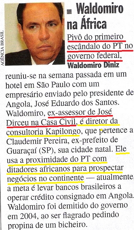 Da Veja, né? Êta revistinha “reacionária” e “de direita”, meu deus! Tão de direita que, agora, tá inventando, até, que Valdomiro (Diniz, lembra?) estaria pelejando pela África:
