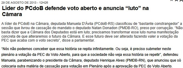 A líder do PCdoB na Câmara, deputada Manuela D’Ávila (PCdoB-RS) classificou de “bastante constrangedor” a sessão que livrou de cassação do mandato o deputado Natan Donadon (PMDB-RO), preso por corrupção. “Não basta dizer que a Câmara dos Deputados está em luto; precisamos transformar esse luto numa manifestação concreta de que alteraremos o futuro da Câmara. E esse futuro deve ser alterado fazendo valer a votação da PEC que acaba com o voto secreto”, disse a parlamentar.