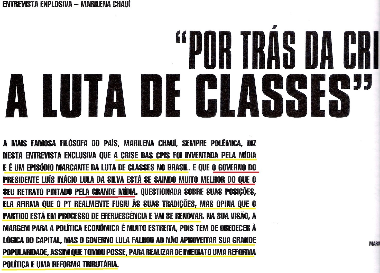 Aliás, a mesma filósofa que eu li e aplaudi tanto nos anos 80 também disse (Caros Amigos, nº 104, nov/2005), que a “crise do Mensalão foi um produto da mídia“: