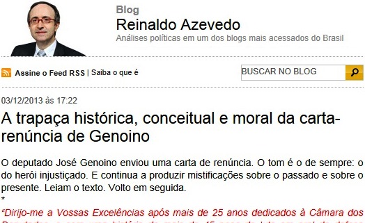 O deputado José Genoino enviou uma carta de renúncia. O tom é o de sempre: o do herói injustiçado. E continua a produzir mistificações sobre o passado e sobre o presente. Leiam o texto. Volto em seguida. * “Dirijo-me a Vossas Excelências após mais de 25 anos dedicados à Câmara dos Deputados, e com uma história de mais de 45 anos de luta em prol da defesa intransigente do Brasil, da democracia e do povo brasileiro, para comunicar uma breve pausa nessa luta, que representa o início de uma nova batalha dentre as tantas que assumi ao longo da vida. Assim, e considerando o disposto no inciso II, do artigo 56 da Constituição Federal; Considerando ainda, a transformação midiática em espetáculo de um processo de cassação; Considerando, de outro modo, que não pratiquei nenhum crime, não dei azo a quaisquer condutas, em toda minha vida