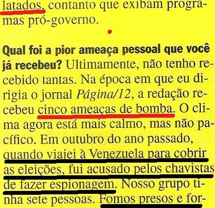 Lembra de “risadas”, acima? Veja a entrevista do apresentado de TV argentino que foi preso na Venezuela, onde foi filmar uma das muitas eleições de Chaves (só pra lembrar: as páginas amarelas de Veja são aquelas mesmas onde aparece gente como Aldo Rabelo e Ferreira Gullar (veja LULA LÁ, GULLAR, ALDO REBELO… (e Marcos Valério). PARABÉNS, VEJA!), Gilberto Carvalho (o Chefe de Gabinete dos presidentes Lula e Dilma, veja SEM MEDO DE SER FELIZ), o governador Wagner (“O BRASIL NÃO COMEÇOU COM O PT”) e o então deputado José Eduardo Cardozo (atual ministro da Justiça, veja UM OUTRO MUNDO É POSSÍVEL (VEJA MENTE II):
