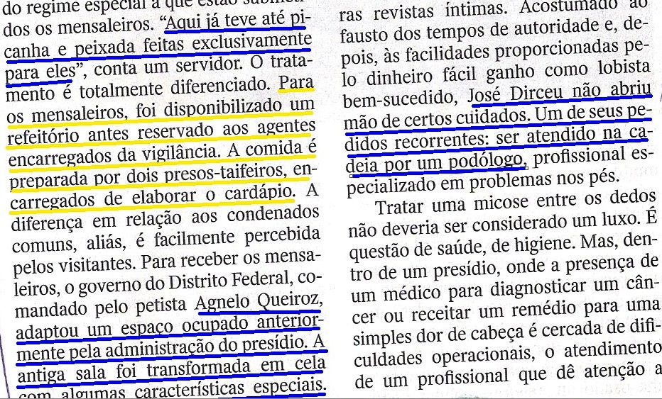 uanta indignação contra a matéria de capa de Veja, sobre a vida na cadeia de José Dirceu. Fala-se até em violação do direito do preso (http://www.brasil247.com/pt/247/midiatech/133621/Dines-refor%C3%A7a-Veja-cometeu-crime-de-imprensa.htm), que, aliás, estaria no regime fechado (http://www.brasil247.com/pt/247/midiatech/133287/Veja-refor%C3%A7a-campanha-para-manter-Z%C3%A9-Dirceu-preso.htm), quando deveria estar no aberto (ou semi-aberto, sei, lá). Se é assim, que outro preso (“ político” ou não; veja NO TEMPO DO “PIG”, OUTRO MUNDO É POSSÍVEL (VEJA MENTE II, MULTIUSO 21…) goza das condições legais do ex-Chefe do palácio de Lulae ex-Presidente do PT? Fechado? Como, se o homem (segundo um site quase oficial) recebe visita até de governador…