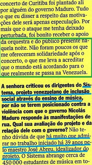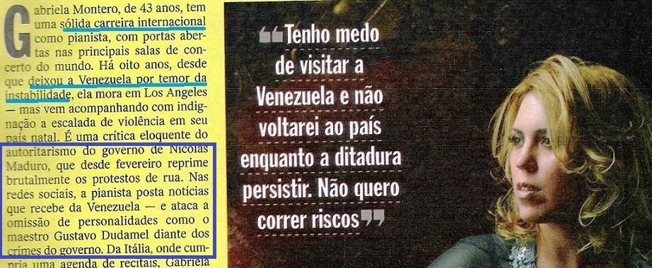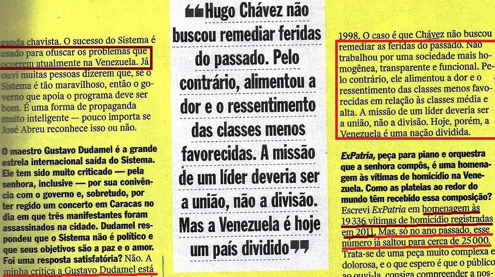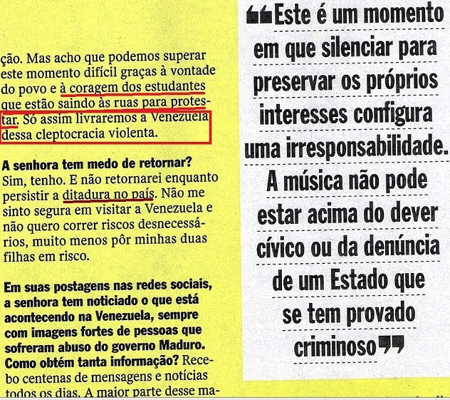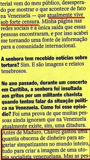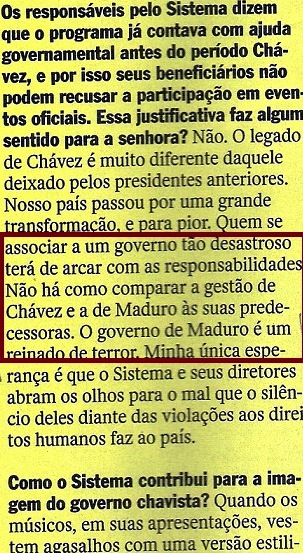 Peraê: “…Reinado de terror?“, “25 mil vítimas de homicídio“? Oxe! Um governo tão defendido pela “esquerda” e tão ajudado por um Brasil que tem até uma COMISSÃO DA VERDADE? Alguma cosia deve tá errada… (veja VIDEOGRAMAS DE UMA REVOLUÇÃO, VOCABULÁRIO DE IDEIAS PASSADAS…). Nas páginas seguintes, a entrevistada continua a falar da “brutalidade” e do espírito oligárquico (domínio, uso, clientela…) do regime bolivariano (veja A QUESTÃO DA MENTALIDADE E OS TRÊS ESPÍRITOS) e de moralidade. Destaque para: “…mudou o estado moral e psicológico do país…“.