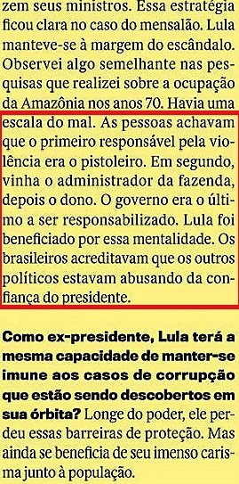 siva da sociedade brasileira contra as forças aqui descritas ─ o coletivo que se chama “oligarquia” e que foi absorvido, habitado e comandado por Lula e pelo PT em seus treze anos no governo (…) Não existe nessa turma toda um único preto ou pobre ─ é só elite, e dentro dela há uma alarmante coleção de cidadãos que faz anos convivem em intimidade com o ex-presidente Lula, sua família e sua vizinhança (…)