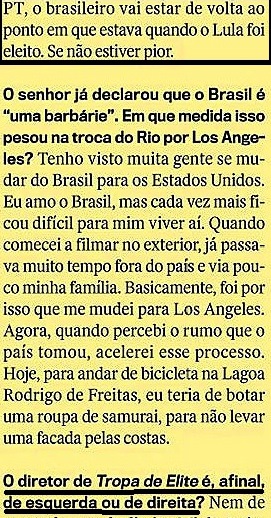 Não esqueçamos da também baiana Aninha Franco, nem do também consagrado José Padilha, abaixo. Mas, leitor, se o raciocínio de Wagner Moura estiver correto, temos de lembrar das imensas maiorias que encheram de indignação verde-amarela as ruas do país, recentemente… Ou elas seriam teleguiadas? Ou essa maioria de que faço parte desde o início do PT não conta?