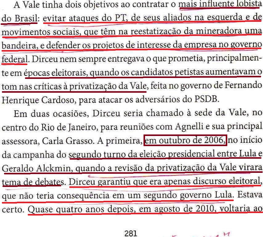 Entre 2006 e 2012, Dirceu teria faturado, por baixo, quarenta milhões de reais, como lobista, no Brasil, Argentina, Bolívia, Colômbia, Venezuela, Cuba, Nicarágua,República Dominicana, México, África e até na França de François Hollande, segundo as fls. 276/312. E, ganhando da Vale, garantiu ao seu presidente que toda aquela espuma eleitoral pela “reestatização” era só espuma mesmo: