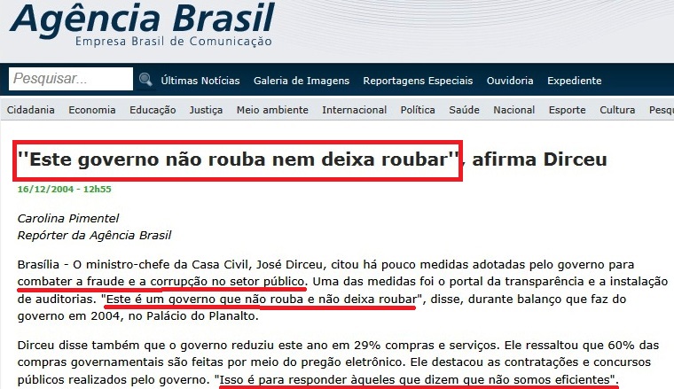 Quando o partido assumiu a Presidência da República, o apetite saneador cessou de repente. O PT havia se aliado aos corruptos de outrora, e a máquina sindical passou, então, a trabalhar para esconder provas de corrupção da turma no poder. Os bem treinados fundamentalistas do partido se engajaram em outra frente de batalha – clandestina como as antigas, suja como as antigas, mas movida por objetivos bem menos nobres do que os antigos. Em seus nove anos de governo, o PT e os petistas estiveram metidos em grossos casos de corrupção. Convertidos aos novos tempos, os fundamentalistas continuaram sendo acionados, mas para proteger os criminosos. Eles agem sem nenhum escrúpulo, recorrendo, se necessário, à falsificação, à fraude e à mentira. Foi assim em 2006, quando um grupo de militantes foi preso comprando um dossiê falso em São Paulo. Foi assim em 2008, quando funcionários da Presidência forjaram documentos com informações sobre os gastos do governo anterior. E, descobre-se agora, também foi assim no mensalão, o maior de todos os escândalos…”; Veja, ed. 2247, 14/12/11.