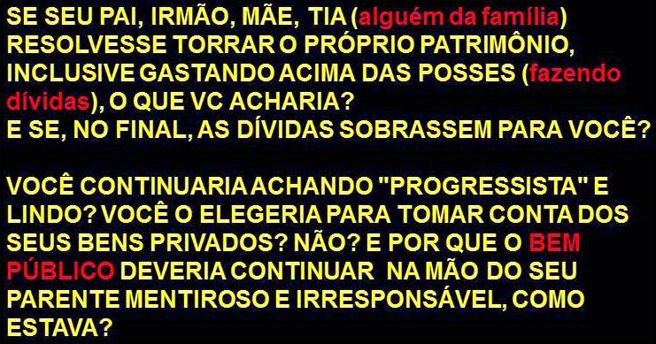 ES, a da predação dos fundos de investimentos e das empresas estatais, e a do aparelhamento irresponsável e incompetente da máquina pública. Foi uma farra mais para orgia (…) Desacreditados e desmoralizados pelo estelionato eleitoral, a corrupção generalizada, a incompetência, as fraudes, a derrocada da economia e a repulsa que levou milhões de brasileiros às ruas nos últimos 15 meses, são incapazes de um gesto de arrependimento ou renúncia...”