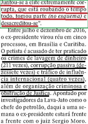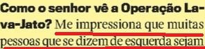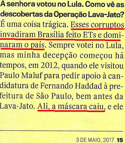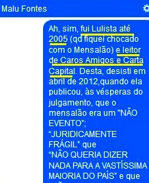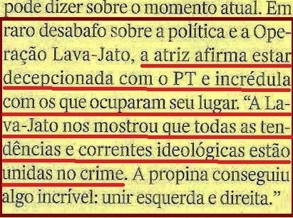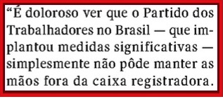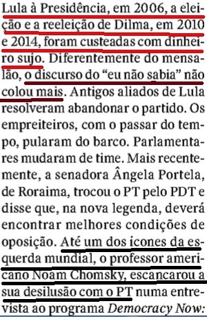Já na igualmente antiVeja CAROS AMIGOS, aquilo que seria um escândalo em qualquer parte minimamente razoável (sujeita a regras com fins públicos; veja CONSELHO DE ÉTICA) do mundo, a “filósofa” Marilena Chauí estampou que a “CRISE (do mensalão) ERA PRODUTO DA MÍDIA”… Você imagina o que ela (e toda a “esquerda”) diriam e fariam se aquela galera do mal fosse outra, leitor? Ave!! E o que declamariam se o PLANO REAL (o fim da inflação e, portanto, da perda de renda do trabalhador e a organização da economia e do Estado brasileiros que os dois governos Lula respeitaram) fosse obra do PT, e o Mensalão/ Petrolão, do PSDB?