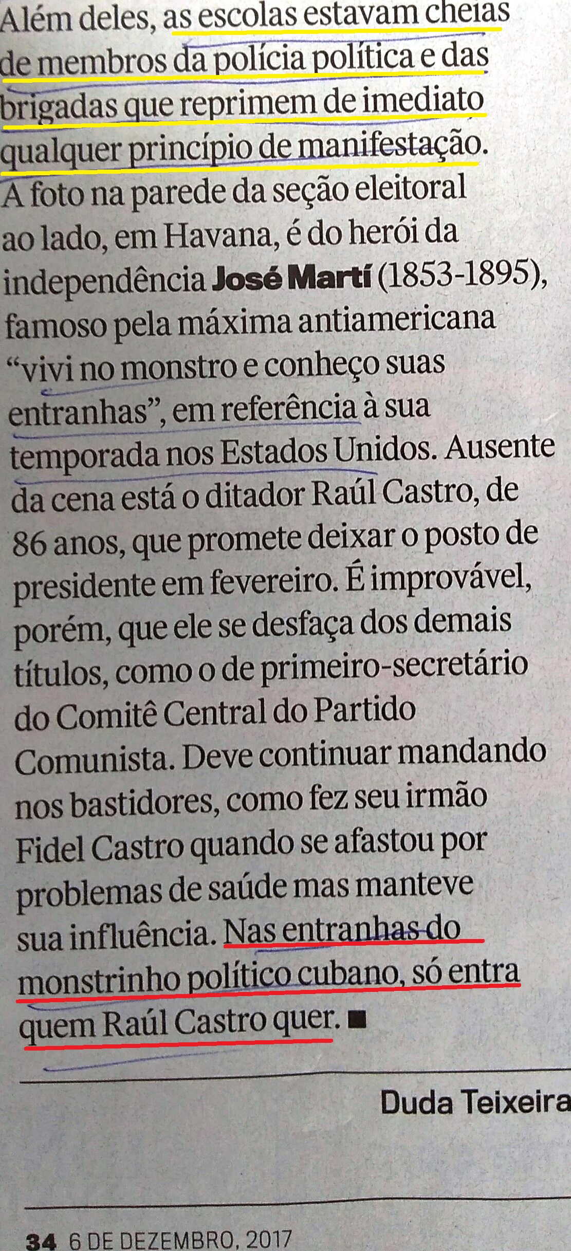 (…) Resumem: ‘Cuba é uma ditadura’. Peço demonstrações: ‘Aqui não existem eleições. A democracia participativa, direta, popular, é um fachada para a manipulação. Não temos campanhas eleitorais, só temos um partido, um jornal, dois canais de televisão, de propaganda, e, se fizéssemos um discurso em praça pública para criticar o governo, seríamos presos na hora’.
