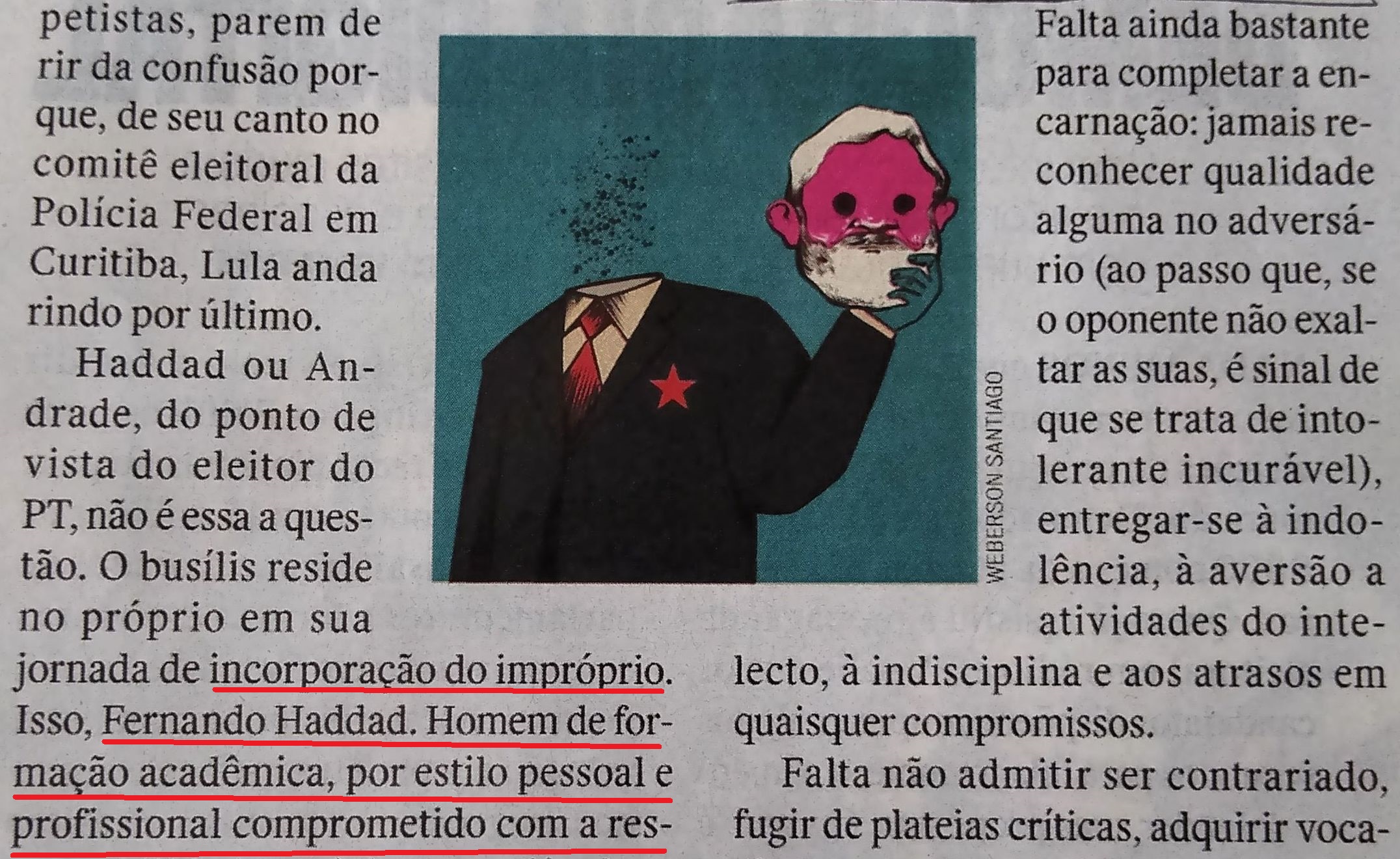 de ética, participação, desenvolvimento e justiça social, marca do PT-de-origem, não se cumpriu e, pelo jeito, não vai se cumprir sob Lula. Por quê? Porque o PT que chegou ao poder foi outro. Aquele primeiro bico generoso bolinou, mas não chegou a romper a casca do ovo. Fora derrotado pelo atual, que, cooptado, transformou-se na própria lógica que o primeiro combatia…”.