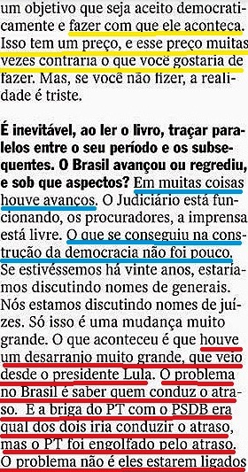 P: Ministro, aproveitando a lucidez e a sensatez dessas suas palavras (…) quero discrepar… Não houve trauma no impeachment de Collor. Houve um grande alívio (…) Itamar franco, que era um sujeito medíocre (…) Foi feito o Plano real, a maior revolução social já feita no Brasil (…) Não podemos, agora, falar em “trauma” (…) Estamos todos, aqui, tentando salvar um pedacinho daquilo que o impeachment de Collor produziu (…)