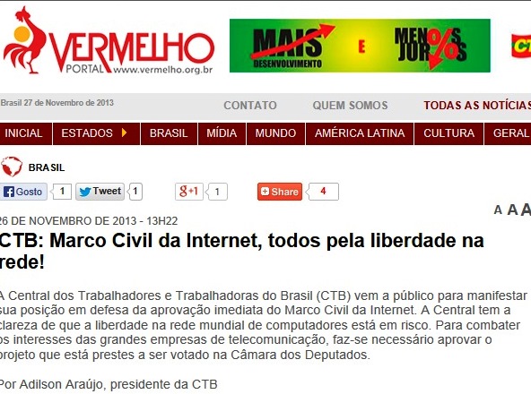 De cara, me bati com a central do PCdoB defendendo privacidade na Rede e liberdade de expressão. Que legal, né? Na sua nota, a progressista central não só usa os termos avermelhados acima, como destaca que