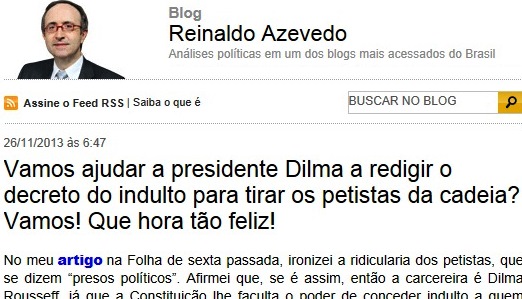 No meu artigo na Folha de sexta passada, ironizei a ridicularia dos petistas, que se dizem “presos políticos”. Afirmei que, se é assim, então a carcereira é Dilma Rousseff, já que a Constituição lhe faculta o poder de conceder indulto a quem quiser. Basta redigir um decreto instituindo os critérios — que é o que o presidente faz todo ano. Em 2012, foi o 7.873 (…)
