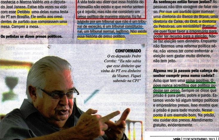 Que comentário infeliz, meu deus! Que grande oportunidade o deputado da oposição perdeu para ficar calado! Alguém falar num dos vinhos e charutos mais caros do mundo (duas preferências de Dirceu, dizem) num momento em que a Democracia brasileira gera presos políticos (veja NO TEMPO DO “PIG” (“PARTIDO DA IMPRENSA GOLPISTA”)) e trata “como bandidos” até os parentes dos comuns (http://www1.folha.uol.com.br/poder/2013/11/1376596-parentes-de-presos-comuns-reclamam-dos-privilegios-de-politicos-na-papuda.shtml)… Que falta de noção!